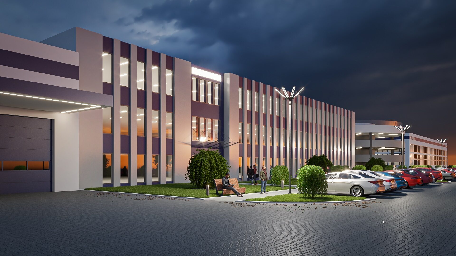 2. Do istniejącej hali od frontu (strona północna) kosztem likwidacji miejsc parkingowych zaprojektowano dobudowę dwukondygnacyjnego modułu logistycznego z trzema bramami przemysłowymi. Przewidziano możliwość wprowadzenia biur dla pracowników produkcyjnych i logistyki na piętrze (ponad bramami). Dla ich obsługi przewidziano w tym miejscu plac manewrowy dla samochodów ciężarowych.