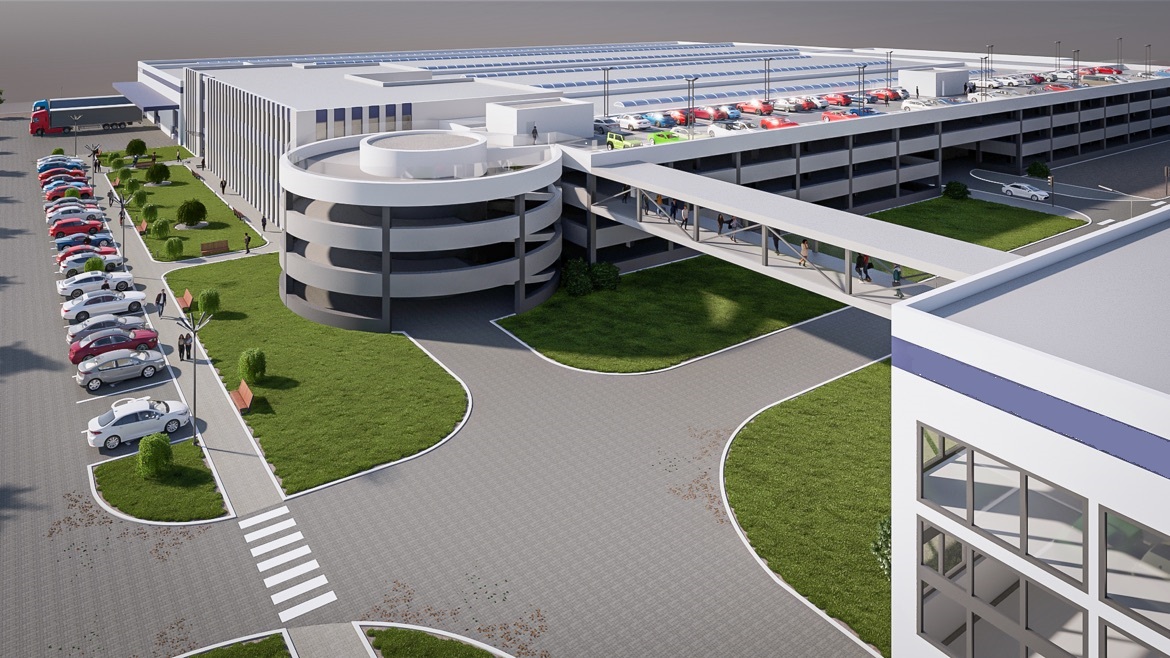 • Budynku produkcyjnego zaprojektowanego jako dwukondygnacyjny budynek o konstrukcji żelbetowej, (przyjęto siatkę słupów 12 x 12 metrów), ze stropem nad parterem ze sprężonych płyt żelbetowych o nośności 10 KN/m2 i posadzką na gruncie o nośności 50 KN/m2. Wysokość parteru w świetle konstrukcji przyjęto na 6.0 metrów a piętra na 4.0 metry. Na parterze w dwóch nawach przewidziano suwnice poruszające się w osiach północ-południe. Od strony północnej (a także częściowo wschodniej i zachodniej) przewidziano duże powierzchnie elewacji jako przeszklone, zapewniające dostęp światła dziennego. Ponadto, ponad kondygnacją piętra przewidziano pasmowe świetliki dachowe usytuowane na kierunku wschód-zachód. Północną połać świetlika przewidziano jako przeszkloną, natomiast południową jako wyposażoną w ogniwa fotowoltaiczne. Południowa nawa budynku umożliwia ponadto wjazd samochodu ciężarowego typu TIR do wnętrza hali i jego bezpieczny załadunek/rozładunek z użyciem suwnic.